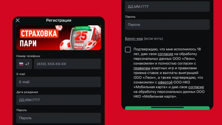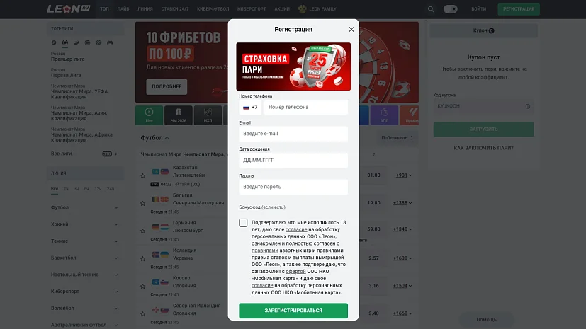 На официальном сайте БК «Леон» перейдите в блок с авторизацией, после чего перед Вами появится анкета для заполнения.