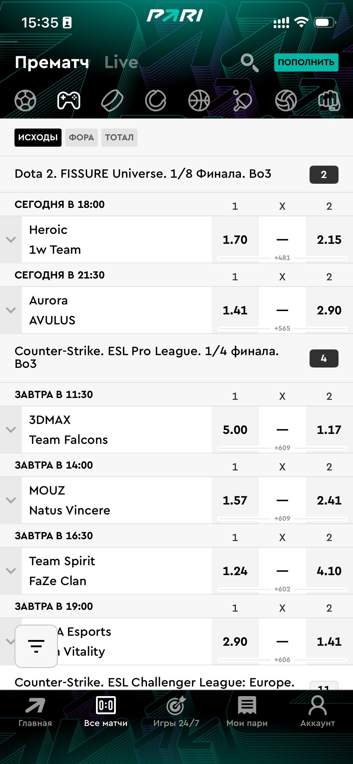 Футбольная роспись PARI отличается вариативностью. В линии представлены форы с возможностью как полного, так и частичного возврата (четвертные форы), разнообразие дополнительных тоталов и фор, индивидуальные тоталы и многое другое. По мере приближения матча количество доступных вариантов ставок значительно увеличивается.