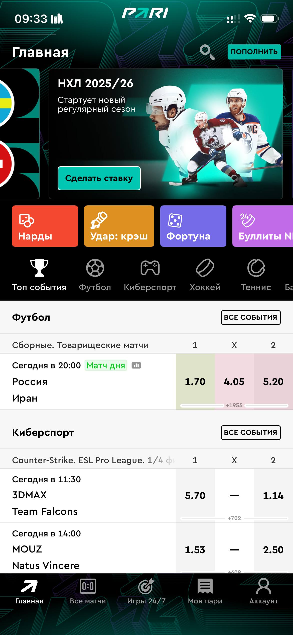Коэффициенты на матчи КХЛ и НХЛ в «Пари» достаточно высоки и соответствуют предложениям других российских букмекеров, с маржой от 4% до 5%. В европейских хоккейных лигах маржа на исходы составляет от 5% до 6%.