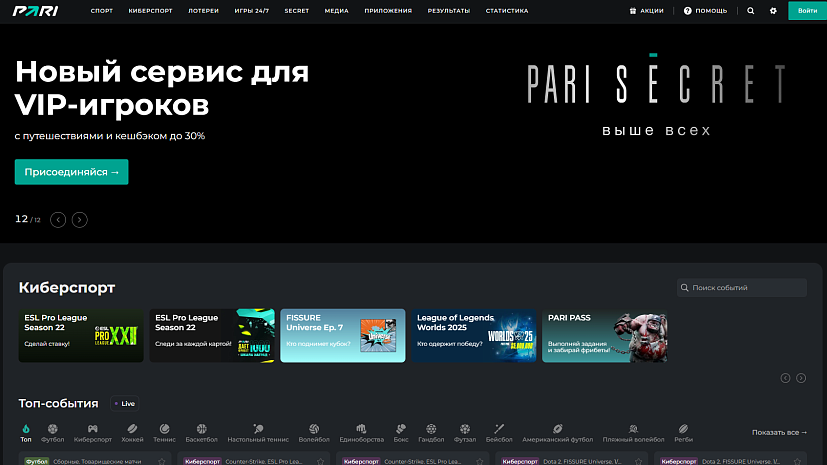 БК предоставляет своим клиентам обширный выбор спортивных дисциплин и турниров с чемпионатами. С полным списком видов спорта и событий Вы сможете ознакомиться на сайте БК «Пари», а ниже представлены более востребованные спортивные дисциплины.