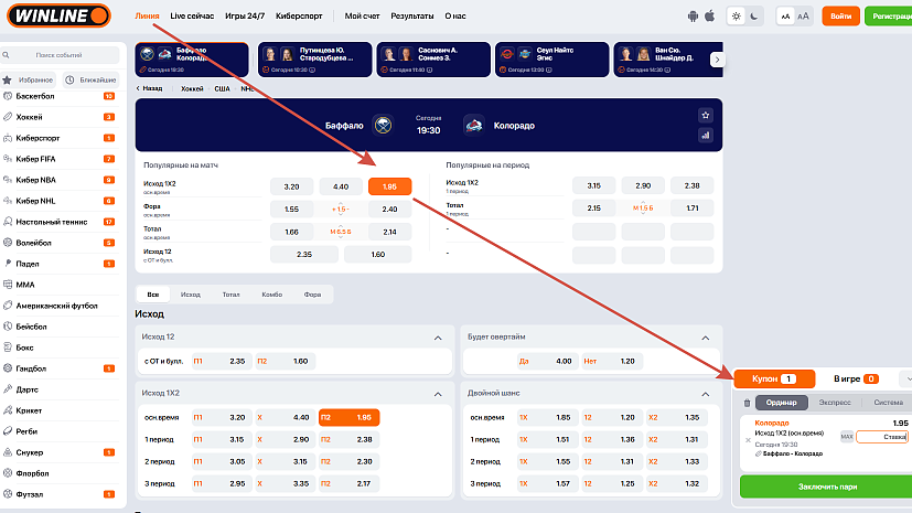 - Найдите нужный Вам вид спорта в линии или лайве.