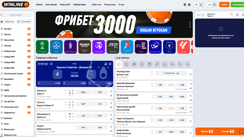 На сайте и в приложении Winline для зарегистрированных пользователей есть доступ к просмотру видеотрансляций различных турниров. Для игроков с отрицательным балансом данная функция недоступна.