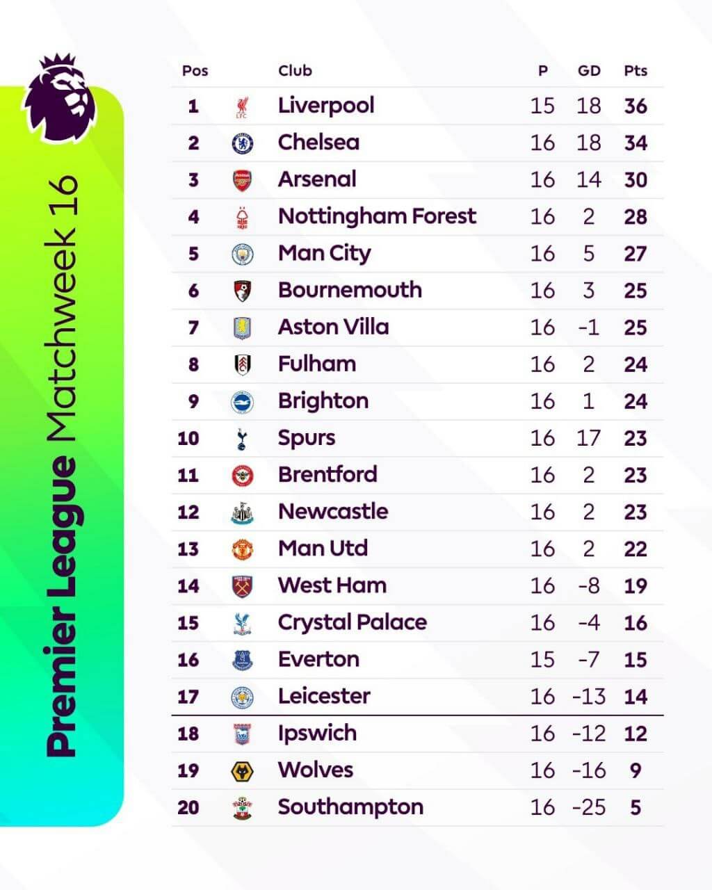 16-й тур АПЛ по праву можно назвать одним словосочетанием: «Топ-клубы АПЛ потеряли очки». Действительно, «Ливерпуль», «Арсенал» и «Ман Сити» потеряли очки и позволили Лондонскому «Челси» стать реальным претендентом на чемпионство АПЛ. В тяжелом матче, синие обыграли «Брентфорд» со счетом 2:1. Отрыв до «Ливерпуля» 2 очка.
