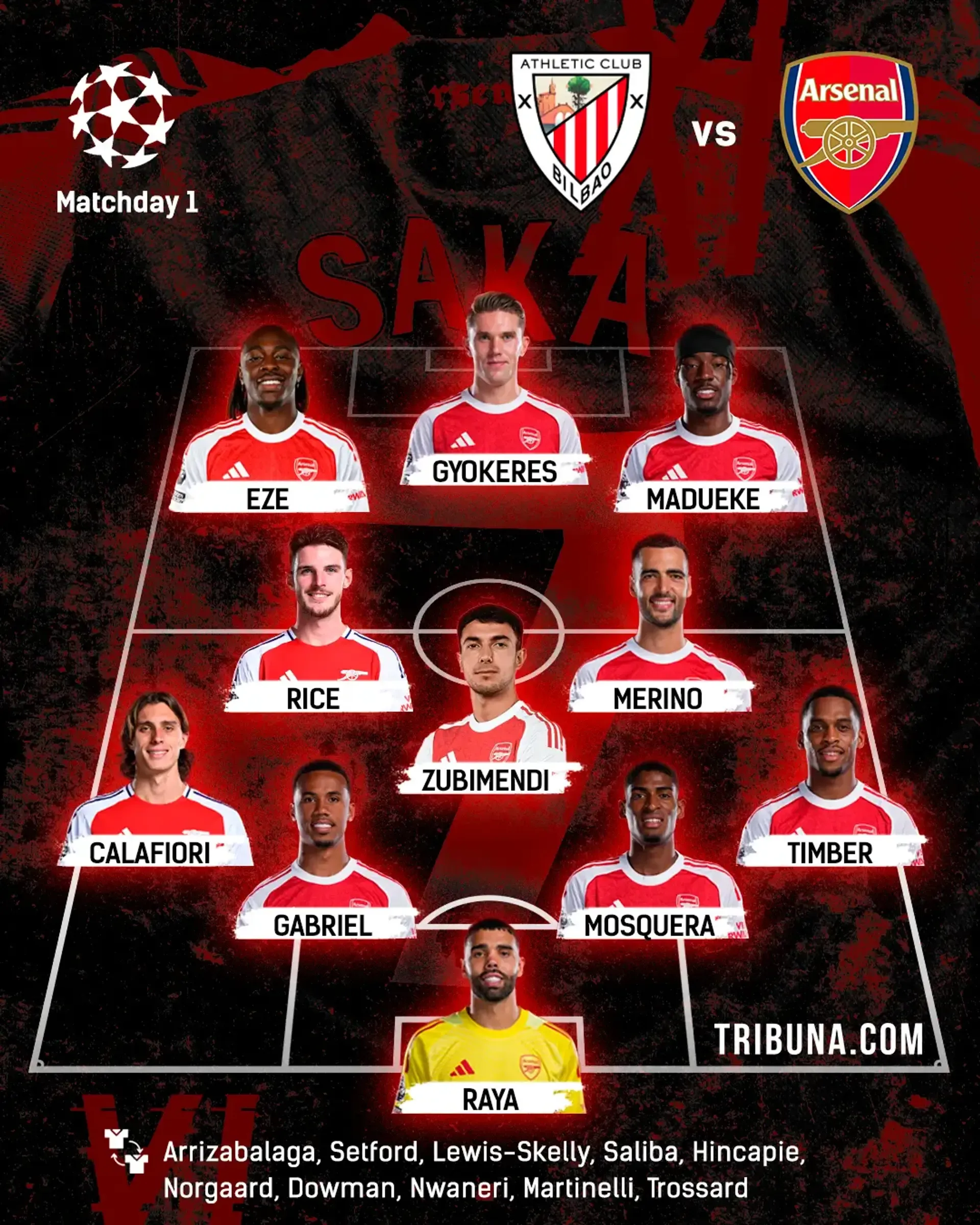 Стартовый состав «Арсенала»: Райя — Тимбер, Габриэль, Москера, Калафьори — Райс, Субименди, Мерино — Мадуэке, Дьокереш, Эзе.