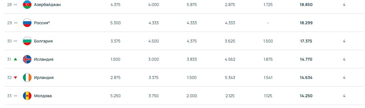 Сборная России и клубы РПЛ продолжают терять позиции в таблице коэффициентов УЕФА. В новом обновлении рейтинга страна опустилась ещё на одну строчку — теперь Россия занимает 29-е место. На этот раз её обошёл Азербайджан.