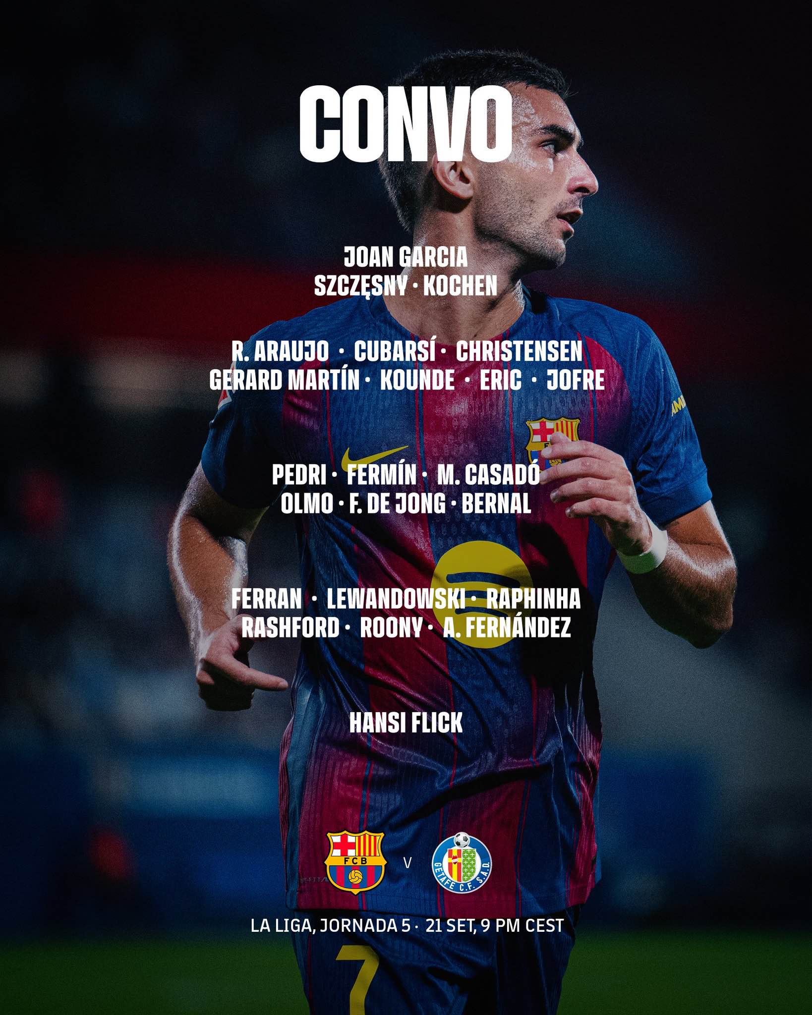 Перед встречей на стадионе им. Йохана Круйффа клуб объявил окончательный состав. Без сюрпризов – Ламин Ямаль, Алехандро Бальде и Гави остаются вне заявки из-за травм.
