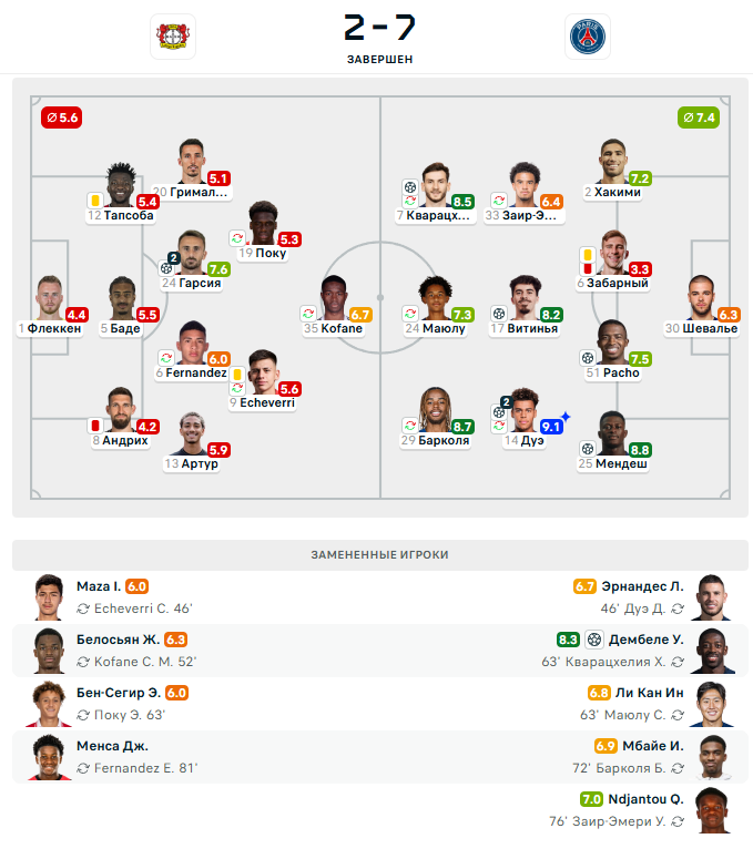 На 31-й минуте «Байер» остался в меньшинстве после удаления Роберта Андриха. А уже на 37-й минуте был удалён защитник «ПСЖ» Илья Забарный.