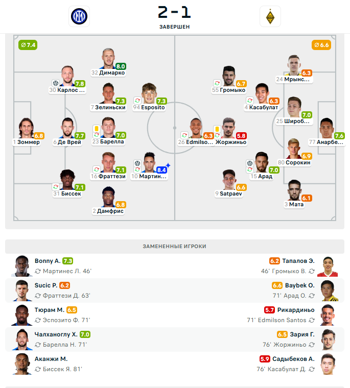 «Интер» одержал четвёртую победу подряд. С 12 очками миланцы находятся на 3-м месте. В свою очередь «Кайрат» с 1 баллом располагается на 34-й строчке.