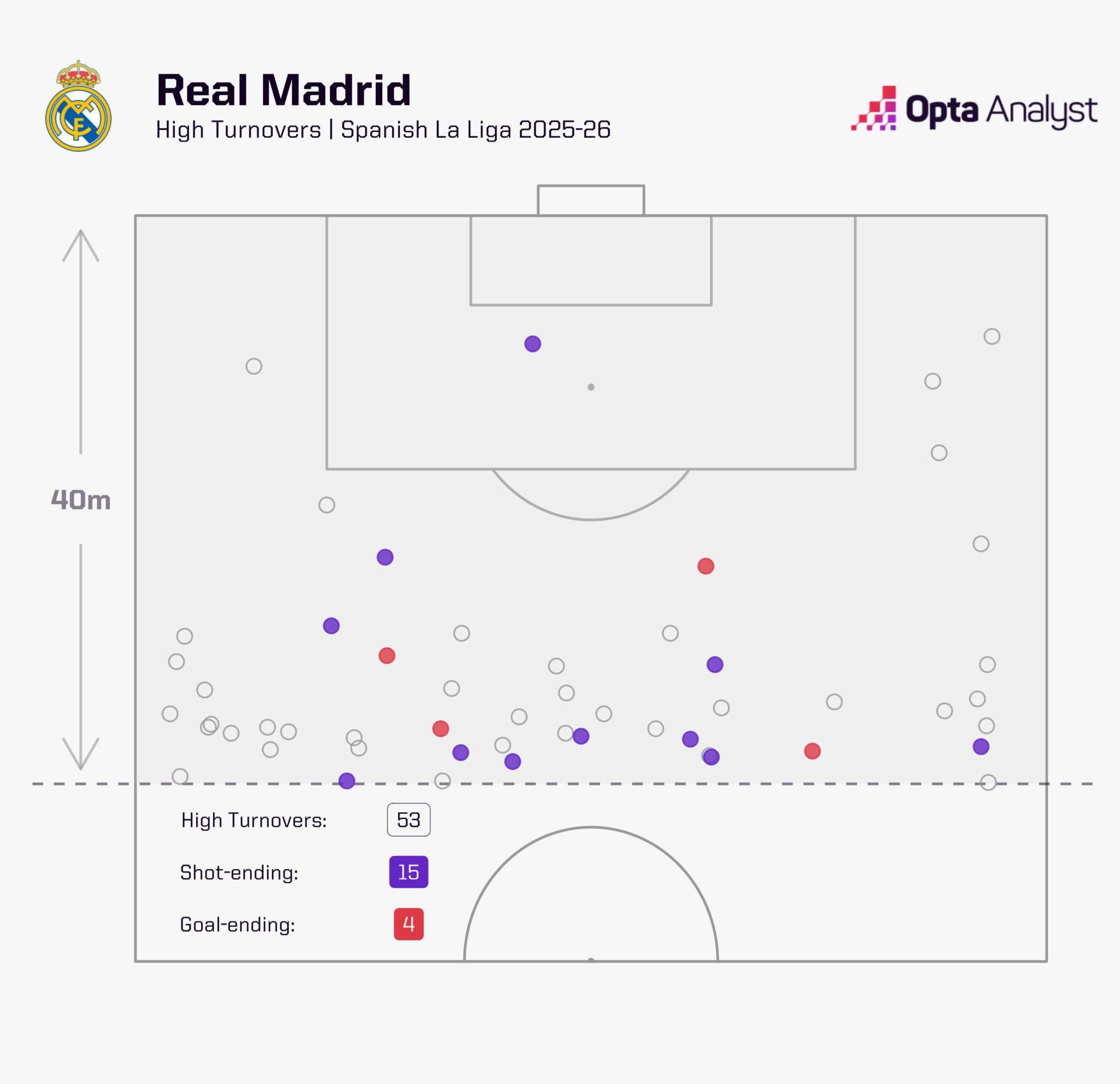 «Реал» стал чаще возвращать мяч вблизи ворот соперника — в среднем 8,8 раза за матч в пределах 40 метров, что почти вдвое превышает прошлогодние показатели.