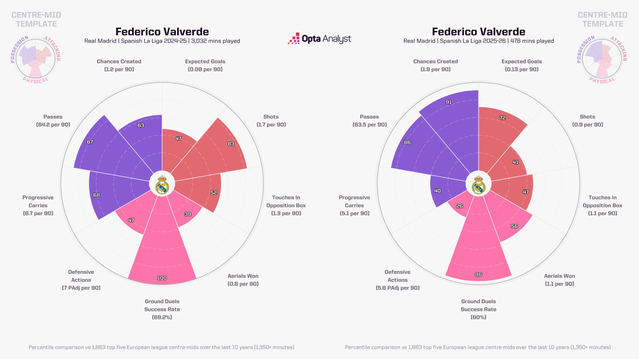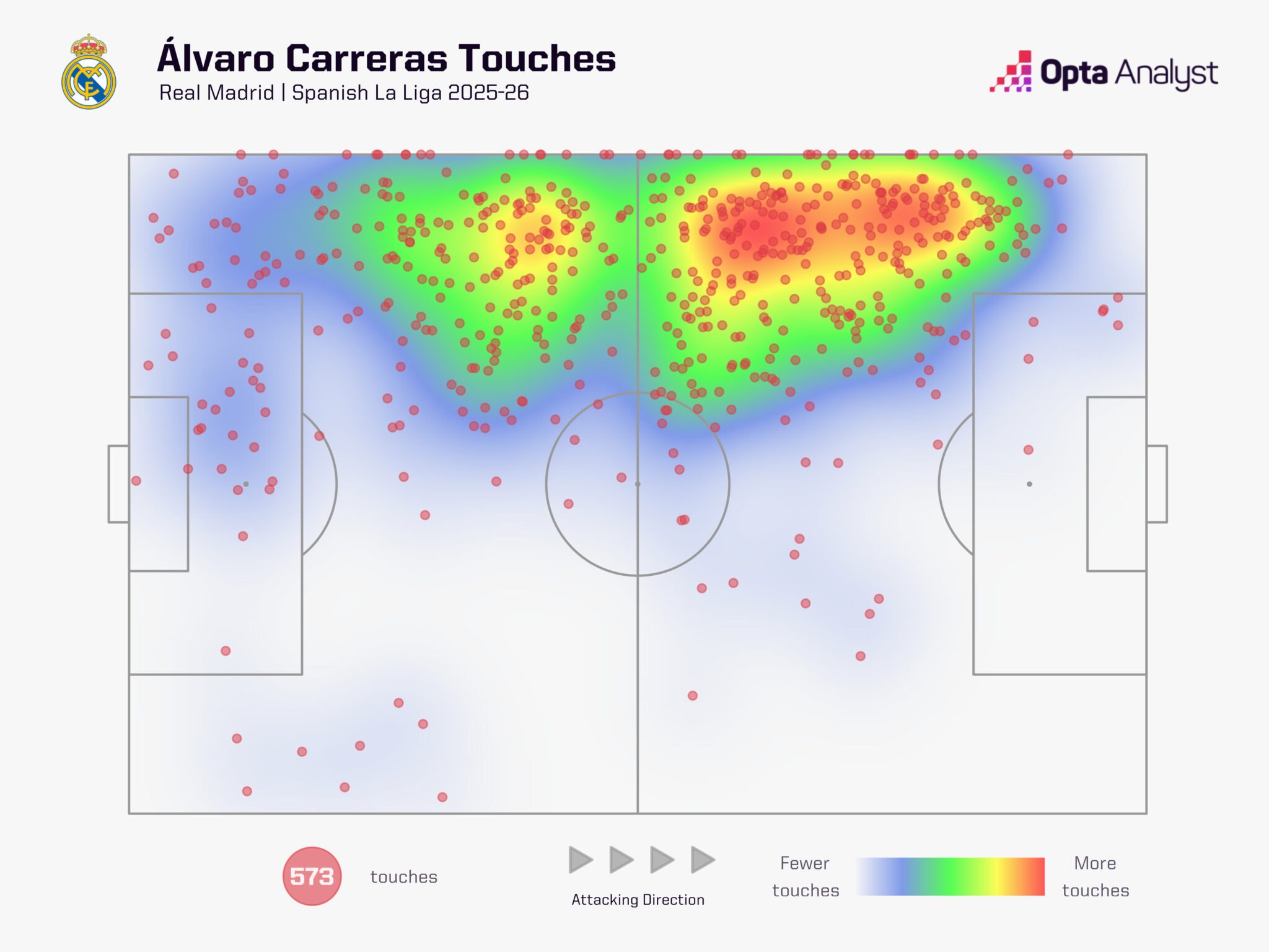 Этот прогресс не только увеличивает число моментов для «Реала», но и меняет поведение соперников. Команды теперь осторожнее выходят из своей половины, опасаясь агрессивного прессинга «Реала». Алонсо делает атаки чуть более размеренными: дополнительные один-два паса дают защитникам время занять правильные позиции, воплощая его философию защиты через контроль мяча. Показатель территориального доминирования (field tilt), отражающий долю владения в атакующей трети, вырос с 64.1% в прошлом сезоне до 72.4% в этом.