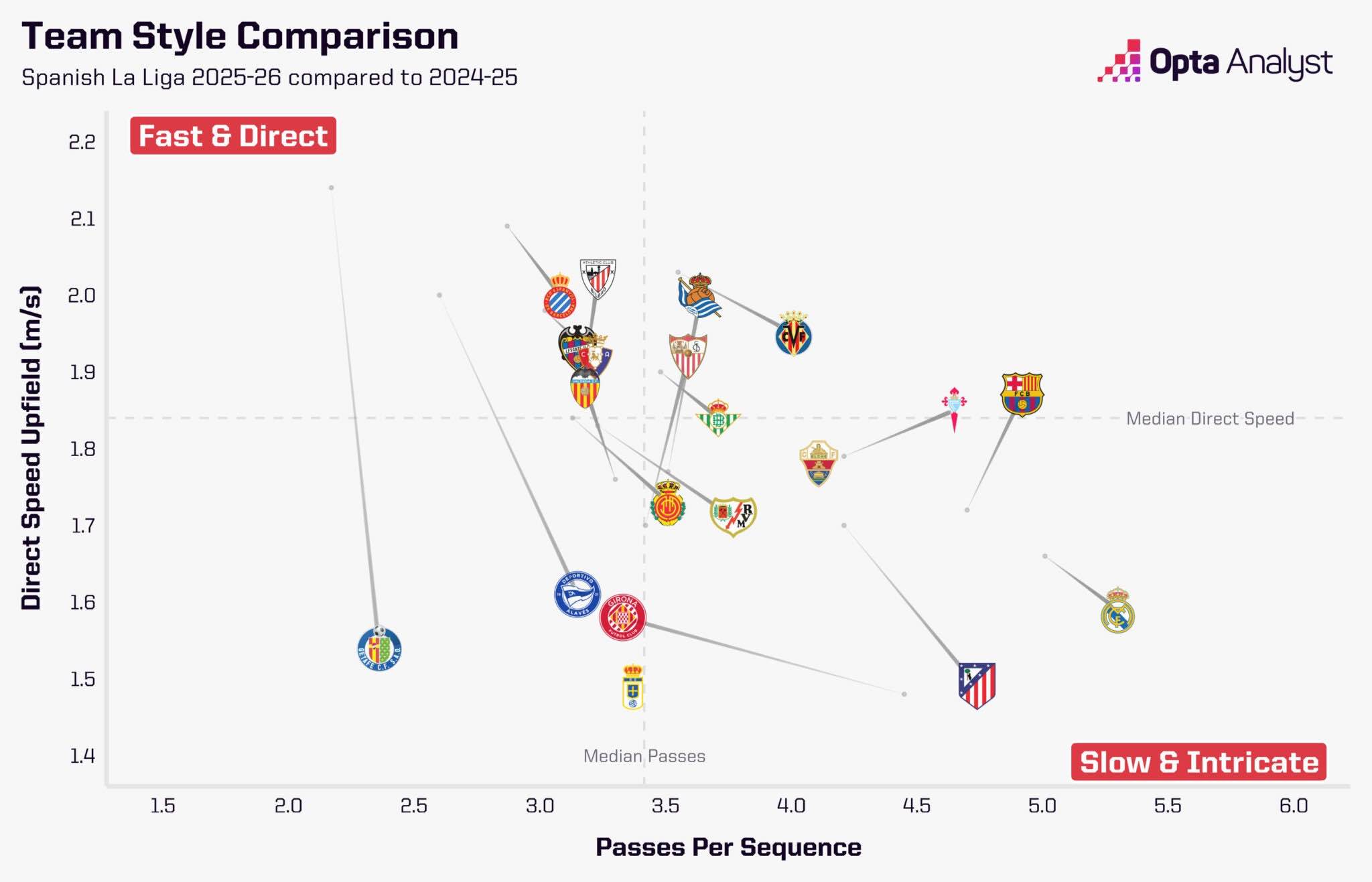 Свой путь он начал с укрепления обороны, сосредоточившись на том, чтобы команда лучше управляла мячом. Сравнение стилей игры команд Ла Лиги за прошлый и текущий сезоны показывает, что «Реал» немного изменил подход.