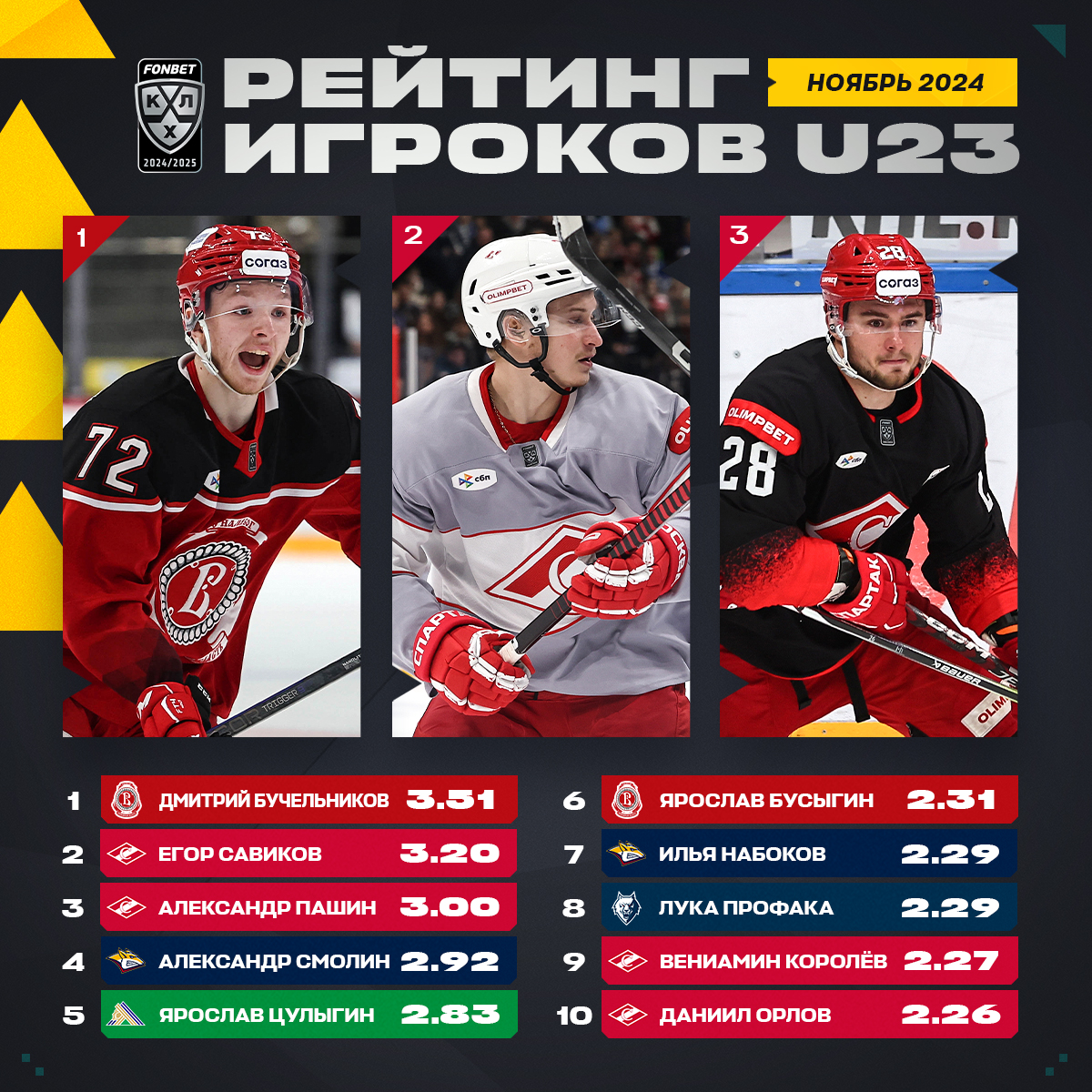 Ярослав Бусыгин в ноябре показал лучший отрезок своей карьеры, набрав 4 очка и забив гол в матче с «Северсталью». Его показатель полезности «+3» и активность в обороне, включая 16 блоков, говорит о его прогрессе. Он продолжает становиться ключевым игроком в обороне «Витязя», проводя на льду более 18 минут в каждом матче.