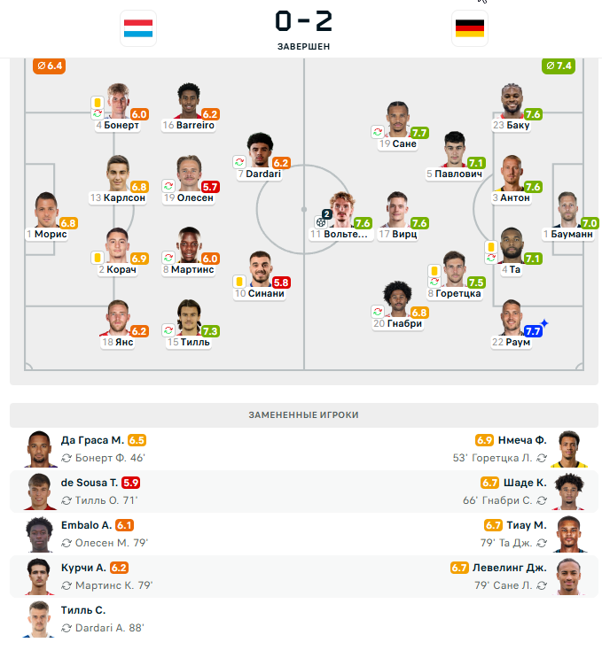 Сборная Германии набрала 12 очков и обосновалась на 1-м месте в турнирной таблице группы A. Команда Люксембурга пока без набранных очков замыкает таблицу.