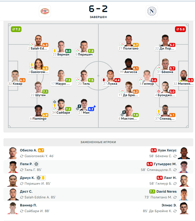 ПСВ с четырьмя очками занимает 11-е место в турнирной таблице. В свою очередь «Наполи» с тремя баллами располагается на 22-й строчке.