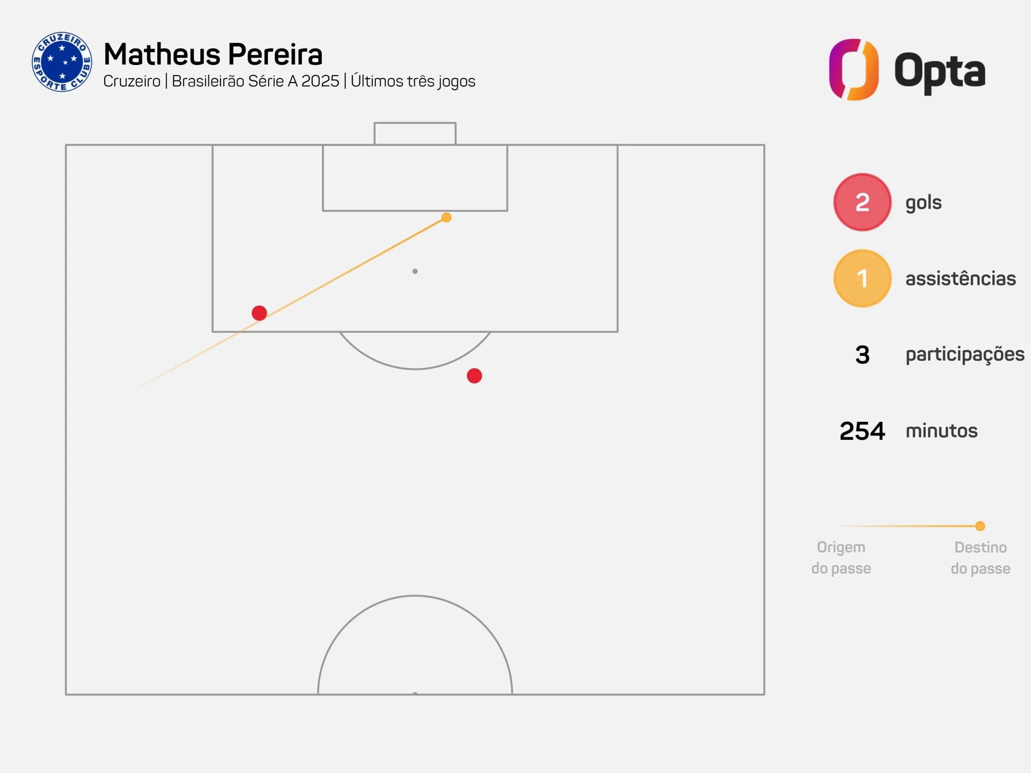 Матеус Перейра демонстрирует лучшую серию в своей карьере в чемпионате Бразилии. В трёх последних матчах подряд он неизменно участвовал в результативных действиях: забил «Сан-Паулу», поразил ворота «Интернасьонала» и отдал голевую передачу в поединке с «Мирассолом». Такой стабильности у полузащитника ранее не было — он находится в отличной форме, по данным Опты.