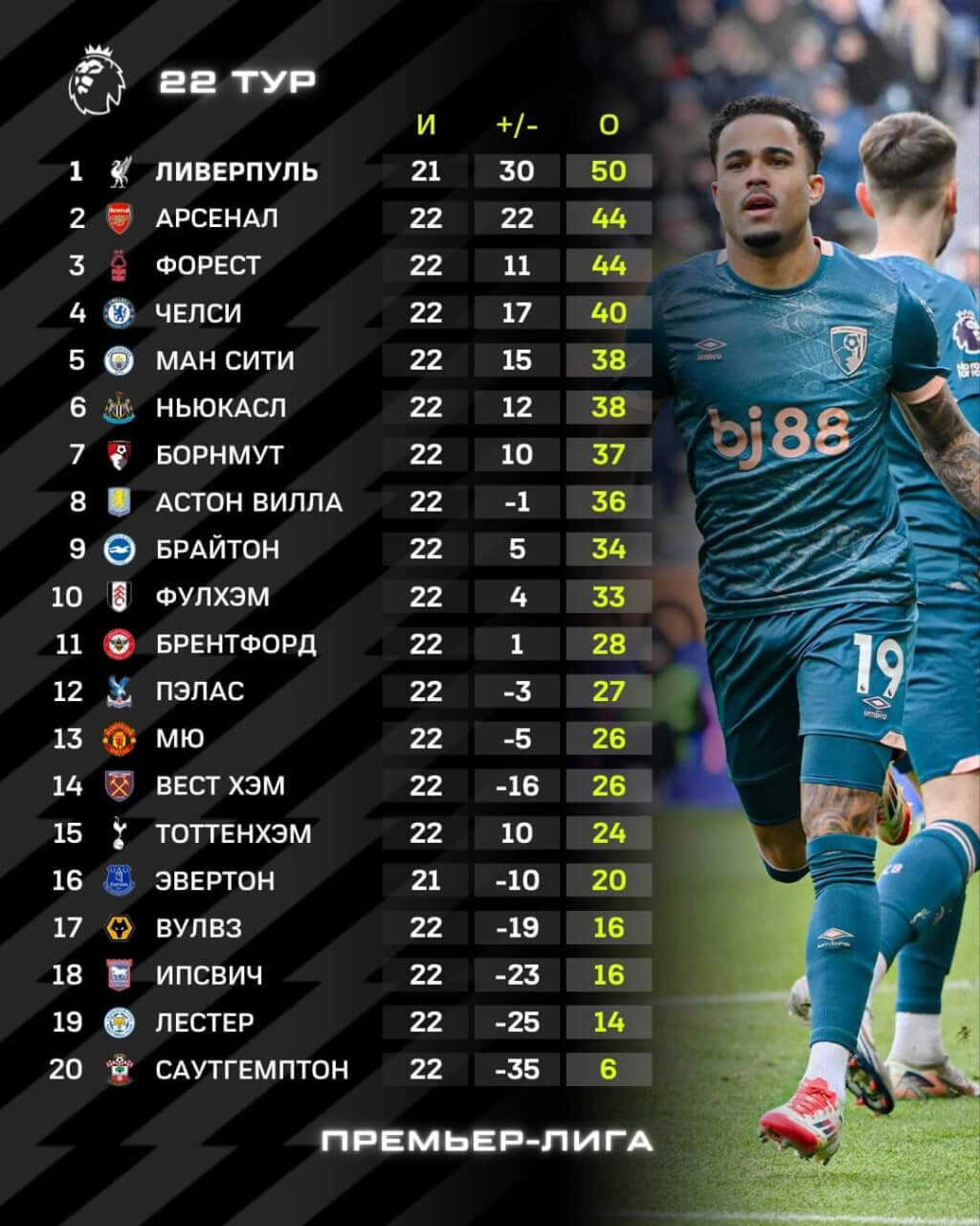 У «канониров» и «лесников» одинаковое количество очков после 22-го тура — 44 балла. Свой матч «Ноттингем» успешно выиграл со счетом 3:2, переиграв «Саутгемптон». А вот команда Микеля Артеты в очередной раз потеряла очки. На этот раз экс-тренер «канониров» Унаи Эмери показал своему бывшему клубу, что такое месть. «Астон Вилла» сыграла с «Арсеналом» 2:2 на «Эмирейтс». «Арсенал» и «Ноттингем» имеют отрыв 4 очка от 4-го места.