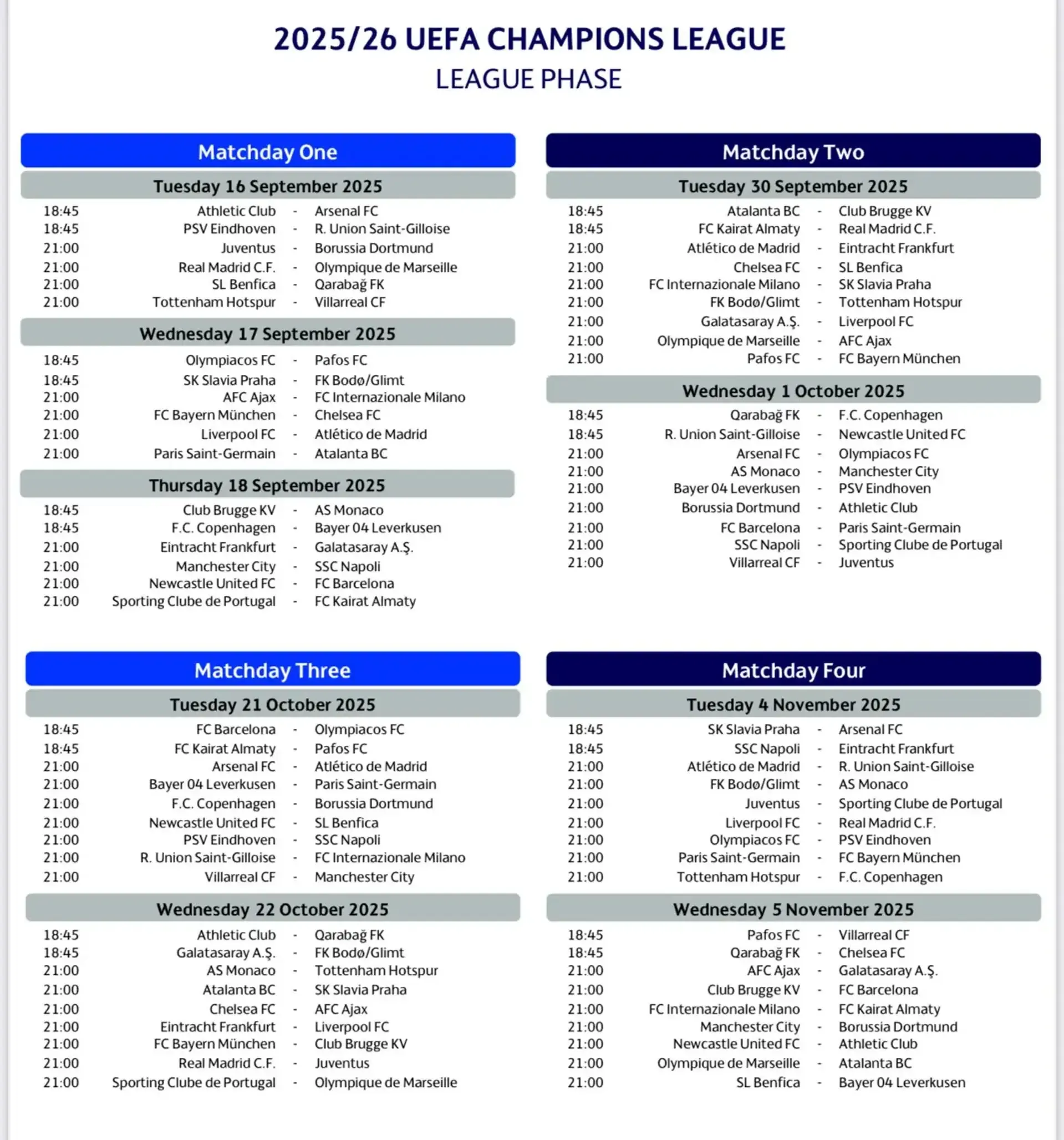 Союз европейских футбольных ассоциаций (УЕФА) официально опубликовал расписание матчей «Барселоны» в Лиге чемпионов сезона 2025/26. Команда Ханси Флика стартует в середине сентября выездным поединком против «Ньюкасла» и проведёт восемь игр на групповом этапе.