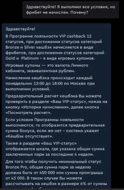 Но тут есть нюанс. Первый ответ ты получаешь от бота, который предложит 2–3 заготовки. Если нужен живой человек — выбирай вариант «связаться с оператором». Обычно отвечают за 1–3 минуты, но в часы пиков (например, перед матчами сборных) — бывает и дольше.