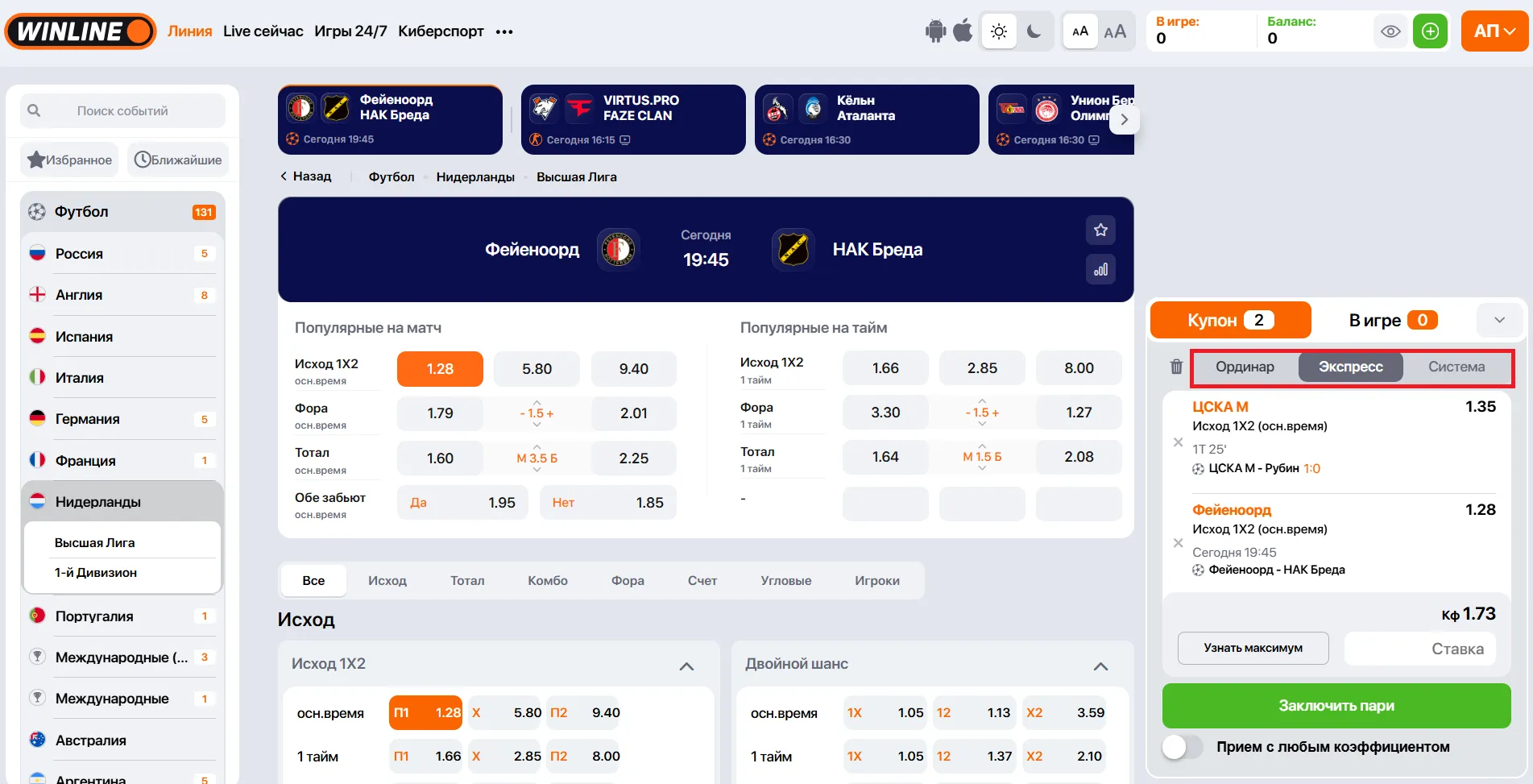 - Экспресс. Несколько исходов в одной ставке. Кэфы перемножаются, но и риски выше. Один промах — и весь купон в корзину.