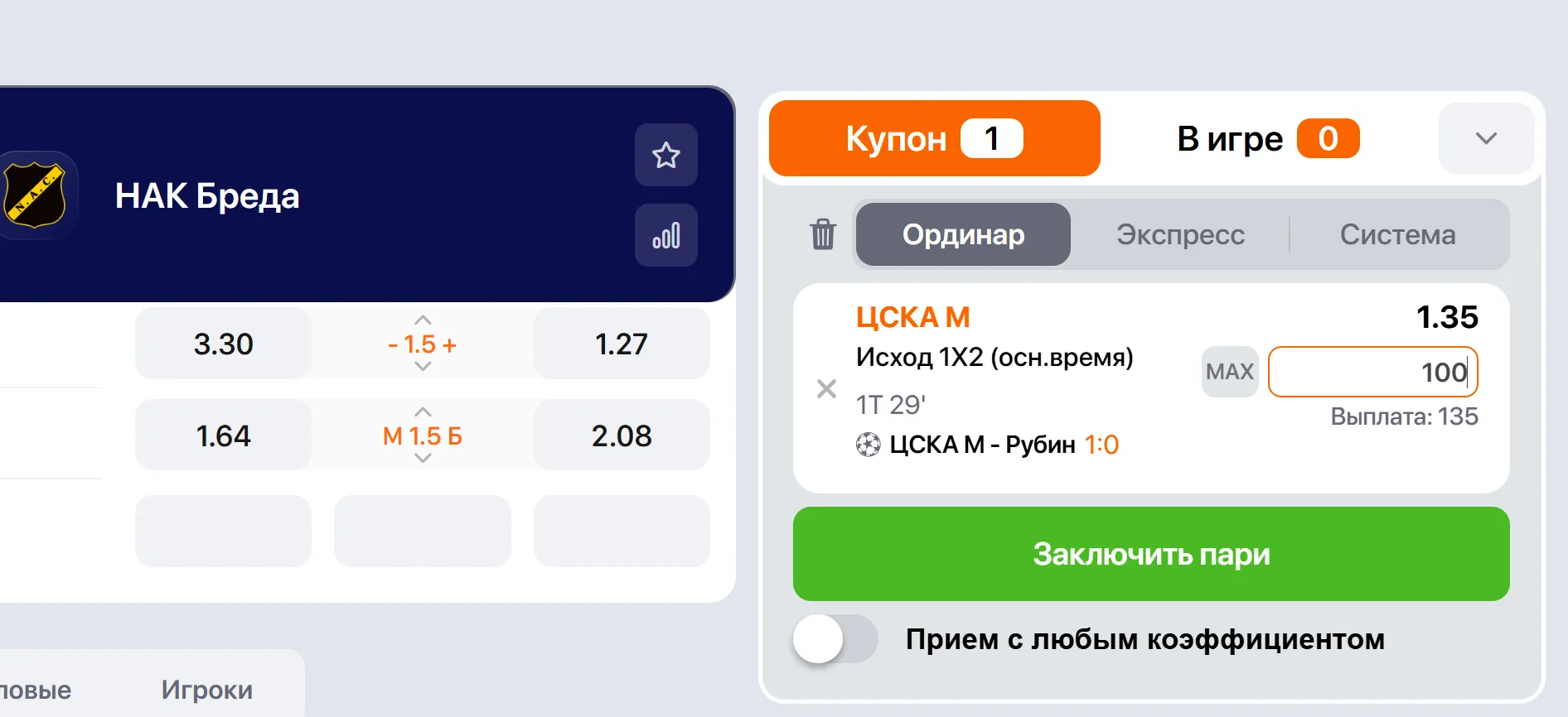- Кликни по коэффициенту — ставка улетает в купон (правый верхний угол).